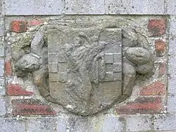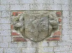 An armorial plaque from the castle ruins[15] is set in the wall of the steading (NS 4 062 3174). The naive peasantry at one time believed that the stone showed two wild men playing at draughts.[27] It bears the impaled arms of the Lindsays and Wallaces.