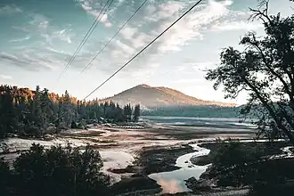 Bass Lake, formerly known as Crane Valley Reservoir, is a man-made lake located in Madera County, California, within the Sierra National Forest, approximately 14 miles (23 km) south of Yosemite National Park.[3] The lake was formed by the construction of Crane Valley Dam on Willow Creek, a tributary of the San Joaquin River. Completed in 1910, the 145-foot (44 m) concrete gravity dam was built to generate hydroelectric power. Today, Bass Lake supports energy production, recreation, and diverse ecological habitats.