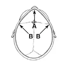 In scaphocephaly, the sagittal suture is prematurely fused. The sagittal suture runs from the front to the back of the head. The shape of this deformity is a long narrow head, formed like a boat (Greek skaphe, "light boat or skiff"). The compensatory head-growth forward at the coronal suture gives a prominent forehead, frontal bossing and a prominent back of the head, called coning.[4] The incidence of scaphocephaly is 2.8 per 10,000 births in the Netherlands; therefore, it is the most common form of craniosynostosis.[5][6]
