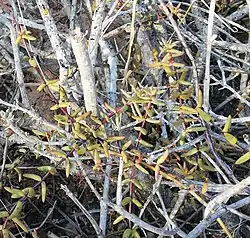 The typical form, with small lanceolate leaves, occurs in the Little Karoo, the Great Karoo as far as Namibia, and in surrounding karooid and mountainous areas, as well as the Overberg in the southern Cape. The rare variety virgata is only found in the far western Namaqualand, and has smooth leaves on erect branches. The form that occurs around Worcester, in the south-west, also decumbent, sometimes has thin, glabrous leaves and only the young stems are slightly hairy.