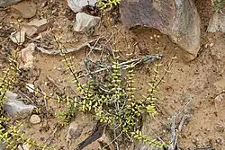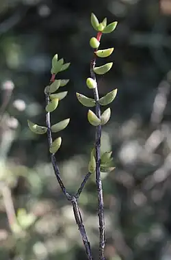 Crassula subaphylla is a small, dense to sparse, straggly shrublet, consisting of numerous brownish stems and branches, 15 – 30 cm tall (up to 60 when scrambling in vegetation). Branches are wiry, woody, but thin and brittle, twiggy (usually decumbent), with flaking strips of bark. Younger branches are slightly velvety (puberulous), reddish-brown, carnose. The leaves are widely dispersed along the branches with internodes of 0.5 — 1 (-3) cm, variable in shape, hairiness and colour (greyish- or reddish-green to yellow-green), distinctively pointed/conical (lanceolate-linear), and easily break off, 5 – 23 mm long and 4 – 8 mm in diameter. It flowers in spring to mid-summer with thyrses up to 8 cm tall with numerous dichasia. The flowers are cream with brown anthers, tubular, panduriform, to 5 mm, have distinctively recurved membranous wings on both sides of the petal tips.[2][3]