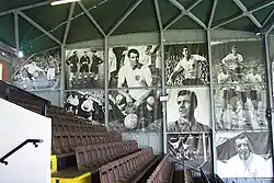 Although Fulham were relegated, the development of Craven Cottage continued. The Riverside terracing, infamous for the fact that fans occupying it would turn their heads annually to watch The Boat Race pass,[33] was replaced by what was officially named the 'Eric Miller Stand',[34] Eric Miller being a director of the club at the time.[35] The stand, which cost £334,000[33] and held 4,200 seats, was opened with a friendly game against Benfica in February 1972, (which included Eusébio).[36] Pelé was also to appear on the ground, with a friendly played against his team Santos F.C.[37] The Miller stand brought the seated capacity up to 11,000 out of a total 40,000.[38] Eric Miller committed suicide five years later after a political and financial scandal,[39] and had shady dealings with trying to move Fulham away from the Cottage. The stand is now better known as the Riverside Stand.[34]