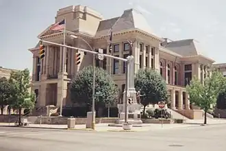 Crawfordsville Commercial Historic District is a national historic district located at Crawfordsville, Montgomery County, Indiana. The district encompasses 105 contributing buildings, 1 contributing structure, and 1 contributing object in the central business district of Crawfordsville. It developed between about 1836 and 1940, and includes notable examples of Italianate, Classical Revival, and Bungalow/American Craftsman style architecture. Located in the district are the separately listed Montgomery County Jail and Sheriff's Residence and Otto Schlemmer Building. Other notable buildings are the Montgomery County Courthouse (1876), Ben Hur Life Building (1911), Hanna-Graham Building, Elston Bank Building (1869), Masonic Temple (1902), Carnegie Library (1902), Commerce Building (1907), Municipal Building (1933), Indiana National Guard Armory (1939), and U.S. Post Office (1940).[2]