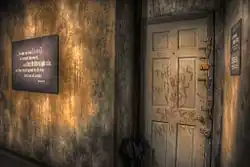 After leaving the corridor, visitors enter a room designed to resemble a decaying urban alley full of graffiti and littered with newspaper clippings about the legalization of abortion, same-sex marriage, and euthanasia.[59] An accompanying placard concludes: "Scripture abandoned in the culture leads to... relative morality, hopelessness and meaninglessness."[59] In the final room in this series, video screens depict the purported results of abandoning a literal interpretation of the Bible.[59] In one, a teenage girl is on the phone with an abortion clinic.[42] In another, a teenage boy rolls a joint while staring at a computer screen; a narrator informs the viewer that the boy is looking at pornography.[42] In the center of the room, a wrecking ball labeled "Millions of Years" damages the foundation of a church building.[10] Nearby stands a Ken Ham mannequin pushing a wheelbarrow full of bricks, symbolizing the reparative work of AiG.[10]