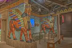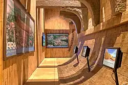 Visitors to the museum follow a sequential series of rooms.[59] Casey Kelly and Kristen Hoerl explain that "the museum constructs an argument chain in which claims from previous rooms provide support for subsequent claims".[59] The first room in the sequence contains a diorama of two paleontologists uncovering the skeletal remains of an indistinct creature.[59] Two actors meant to represent the paleontologists are displayed on television screens mounted nearby; one explains that he believes that the creature died in a local flood millions of years earlier, while the other surmises that the creature died in the biblical Great Flood about 4,300 years earlier.[59] This room is immediately followed by a second room of placards explaining various natural phenomena using two distinct "starting points"—mainstream science and the biblical narrative.[59] From here, visitors enter an L-shaped corridor that begins with mannequins representing the Old Testament prophets Moses, David, and Isaiah, while audio recordings of passages from the Book of Psalms are played nearby.[59] Further down the corridor, placards detail historical arguments against a literal interpretation of the Bible and conclude that "The elevation of human reason above God's word is the essence of every attack on God's word."[59] The walls near the corridor's exit contain existentialist questions such as "Am I alone?", and "Why do I suffer?", paired with illustrations of human conflict and suffering.[59]