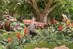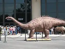 Dinosaurs are prominently featured in many areas of the museum. Prior to the museum's opening, Ham stated, "We're putting evolutionists on notice: We're taking the dinosaurs back... They're used to teach people that there's no God, and they're used to brainwash people. Evolutionists get very upset when we use dinosaurs."[50] While some of the museum's dinosaur models are animatronic, many were sculpted from fiberglass by a taxidermist.[51][52] Near the museum's lobby, a diorama depicts two ancient-age children playing near a stream, unmolested by nearby dinosaurs.[53]