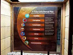 The second series of rooms depict a literal interpretation of the Book of Genesis, arranged around the concept of "The Seven C's in God's Eternal Plan": creation, corruption, catastrophe, confusion, Christ, cross, and consummation.[59] At the entrance to this area, a flat panel television displays a computer-generated imagery (CGI) animation of millions of particles converging to create an adult human male, the biblical Adam.[59] Subsequent creation dioramas show Adam naming animals in the Garden of Eden and Eve being created from Adam's rib.[60] Accompanying placards maintain that the special creation of Adam and Eve conveys God's desire for families to consist only of opposite-sex couples and their offspring.[42]