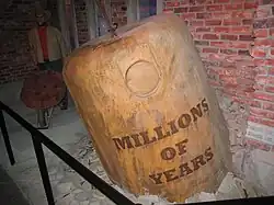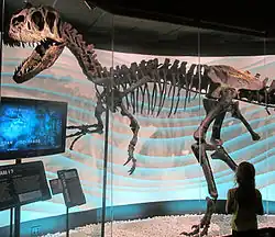 Since 2014, the museum has displayed the skeleton of a 30 feet (9.1 m) long, 10 feet (3.0 m) wide Allosaurus fragilis dubbed "Ebenezer".[54] Over half of the skeleton, including a nearly-complete 3 feet (0.91 m) long skull with 53 teeth, was recovered from the northern Colorado portion of Morrison Formation.[54][55] The Elizabeth Streb Peroutka Foundation of Pasadena, Maryland, purchased the skeleton and donated it to the museum, and AiG paid an anonymous expert based in Utah to restore it before displaying it.[54][55] The skeleton is presented as evidence of Noah's Flood.[56] In 2021, Brian William Delafayette was indicted for making a bomb threat after posting on an AiG-affiliated web page that a bomb had been planted under the Allosaurus display at the museum; no bomb was found at the site.[57]
