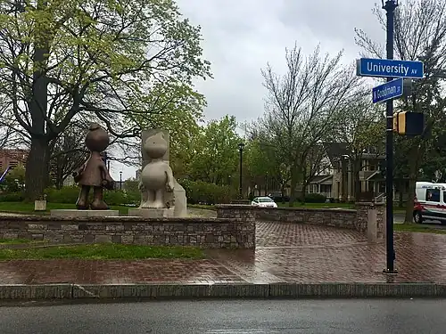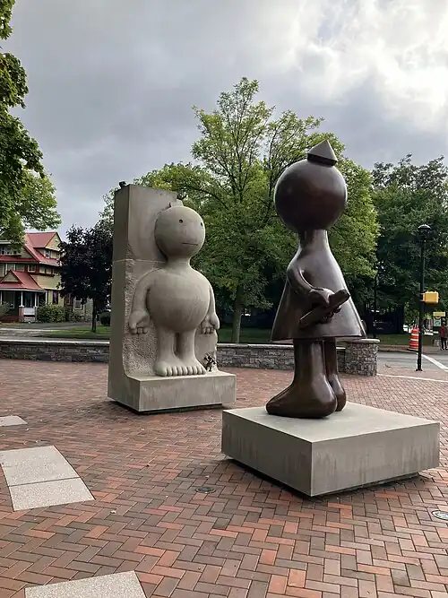 Creation Myth, a public sculpture series created in 2012, spans the rightmost block outside of Rochester's Memorial Art Gallery.[2] The piece consists of cast bronze and carved limestone sculptures that range in size from less than half a foot tall to over six feet tall.[2][3] There are individual forms in amounts going into the tens, making it hard to identify when exactly one sculpture ends and another starts, and thus how many specific sculptures there are in the series. They are, however, arranged into three general clusters, each using a large limestone sculpture as a focal point with smaller bronze sculptures positioned radially around it.[4] Each sculpture depicts a relatively simplistic humanoid character, stylized similarly to the characters Otterness has used in many of his other public sculptures works like Tipping Point[5] and The Public Unconscious.[6] Their heads are composed of perfect spheres with non-angular, bendable-looking limbs protruding from the torso, represented by different geometric forms between statues including cones, spheres, and cubes.[7]