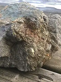 An important geological unit within the SIC is the Sudbury Breccia, which is an impactite interpreted to have been formed during the impact crater modification or excavation.[2] Copper, nickel, and PGE rich sulfides settled to the base of the molten Sudbury Breccia, and formed veins and stockworks of mineralization in the footwall (the non-igneous rocks underlying the SIC).[2][12] Pre-existing weaknesses in the footwall play a crucial role in the distribution of these sulfide-rich structures.[2] This results in a spatial association between the sulfide-rich ore deposit locations and the lithological contact between the footwall and the Sudbury Breccia.[2] The contact between the SIC and the footwall is marked by "broad haloes of metalliferous hydrous silicate minerals",[2] thought to be created by the early process of magmatic-hydrothermal fluid alteration and the late process of metamorphic fluid alteration.[2]