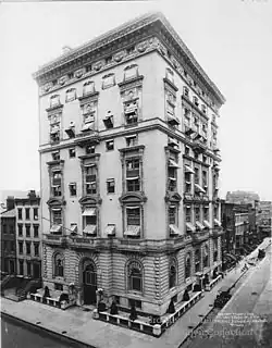 The base of the building is constructed of channelled, rusticated limestone, while the stories above are of a light-colored brick, with terra cotta ornaments. The rusticated ground floor is capped with a prominent cornice which forms a continuous line with a series of balustraded balconies below the pedimented windows. Arising directly from the segmental arches of these window pediments is the third level of windows, an unusual arrangement which serves to enhance the overall illusion of decreased height. Above this level is a second cornice with more balustraded balconies, from which the final level of double-height windows arises. At the top of the building is a row of smaller attic windows, "set within a magnificent terra cotta frieze", and a final, heavy cornice.[3]
