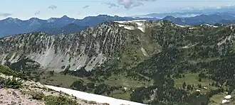 Crescent Mountain, a ridge-like peak standing at 6,715 ft (2,047 m), is located in north-central Mount Rainier National Park, in Pierce County of Washington state.[5] It is part of the Cascade Range, and lies 6.6 mi (10.6 km) due north of the summit of Mount Rainier. Sluiskin Mountain is its nearest higher neighbor, 0.85 mi (1.37 km) to the east.[1] Precipitation runoff from Crescent Mountain drains west into tributaries of the Carbon River.
