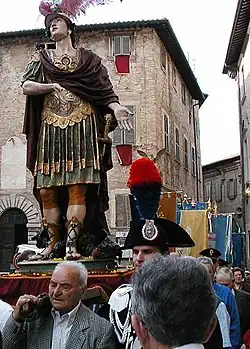 | A statue of Crescentinus borne in procession in the streets of Urbino for his feast day. | |