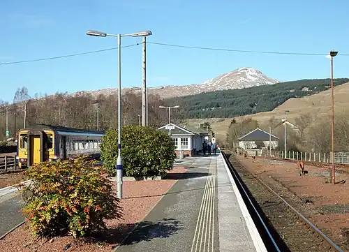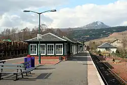Crianlarich railway station is a railway station serving the village of Crianlarich in Scotland. It is located on the West Highland Line, sited 41 miles 25 chains (66.5 km) from Craigendoran Junction, near Helensburgh, with Ardlui to the south, and Tyndrum Lower and Upper Tyndrum to the north west, on the routes to Oban and Mallaig respectively, which diverge immediately north of the station.[3] ScotRail, who manage the station, operate most services (along with Caledonian Sleeper).