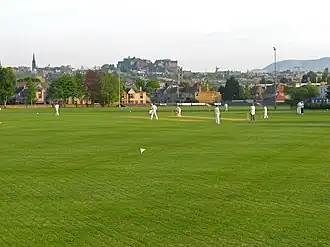 ![]() Cricket at Goldenacre in Edinburgh, with Edinburgh Castle as a backdrop | |