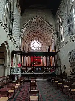 The organ was made in England in 1911 by W. Hill & Son, who also built organs for York Minster, Ely, Worcester, and Manchester cathedrals. The wrought iron staircase was also brought from London. The organ loft houses regimental flags from the Crimean war, two from British military HQ in occupied Istanbul after the First World War and the ensign flag from the battleship that took Mehmed VI, the last sultan, into exile. Its facade is decorated with colourful modern takes on Biblical stories by the artist, Erica Beard.