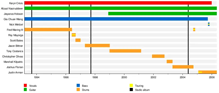 In 1998, Crisis split from Metal Blade Records,[24] citing a lack of support.[12][25] Afterwards, the band recorded a six-track demo with Keith Falgout and contributed "Methodology" (from Deathshead Extermination) and a cover of Twisted Sister's "Captain Howdy" to Dee Snider's Strangeland (1998).[19][26] In December 1998, Crisis recruited Jwyanza Hobson as their second guitarist,[5][8] allowing Nasiruddeen to "experiment with melodies while somebody else could keep the heaviness going".[24] Karyn said the addition of Hobson allowed Wang to play more traditional basslines whilst the guitars did more "atmospheric and rhythmic stuff".[27] In 1999, former Machine Head drummer Tony Costanza joined the band.[19] Following a farewell tour around the area in late 1999,[28] the members of Crisis relocated from New York City to Los Angeles in early 2000,[29] citing a lack of support from record labels on the east coast of the US.[25][23] If they could not find a record label, they planned to establish their own.[23] Karyn said in contrast to when they were living in New York City and "literally starving for our art", the members of Crisis were able to "live more normal lives" in Los Angeles and "explore outside of [the band] with no expectations or demands".[25]