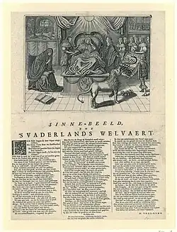 In addition to portraits, he produced engravings of Biblical and historical themes and book illustrations. He created 60 engravings for an influential work on dressage, Maneige royal by Antoine de Pluvinel (Paris, 1623), later published under the title L'Instruction du Roy en l'exercice de monter à cheval. Van de Passe's own Hortus Floridus, published in 1614—1616, was a collection of 160 engravings depicting flowering plants. The work was so popular that the original Latin edition was translated into Dutch, French and English.[2] His Les vrais pourtraits de quelques unes des plus grandes dames da la chrestiente (1640)[note 1] contained two verses dedicated to his sister, the engraver Magdalena van de Passe, who had died two years earlier.[4] In 1643—1644 Joan Blaeu published Van de Passe's Van 't Licht der teken en schilderkonst.,[note 2] a book teaching drawing techniques.[5]