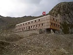 The original Cristallina Hut was built in 1939, but was almost completely destroyed during an avalanche in 1999, the third avalanche to cause the hut serious damage. It was rebuilt in 2002, 150 meters lower, on the Cristallina Pass, situated between the Bavona valley and the Val Bedretto, at an altitude of 2575 meters. The new hut was designed by Baserga Mozzetti, of Muralto.[1]
