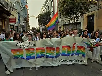 1997 was the year of the first demonstration of homosexual freedom in Spain, a country that has faced a messy history with LGBT issues throughout its history. The first gay pride demonstration was in commemoration of the Stonewall riots which took place in New York in 1969, and the demonstrations from there only grew as a consequence of new legislative changes such as the legalization of same-sex marriage in 2005. By 2014, Madrid Gay Pride experienced a turnover of over one million people, according to the organizers.[9] Gay pride festivals began to take place yearly in over 26 Spanish cities, oftentimes in collaboration with an array of activist organizations, nonprofits, and even for-profit companies. This resulted in what many people perceived as a turn from an active counter-culture to a spectacle for ideology to walk hand-in-hand with commercial floats of large companies.[10] Begonia Enguix writes, "The participation of commercially sponsored floats along with the large influx of tourists that visit Madrid feed the discussions on the commercialization of the event and on the relationship between neoliberalism, identity and protest."[9]