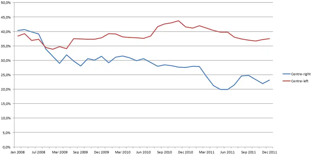 The official campaign began on 17 November and ended on 2 December which was the last day when the candidates could present their ideas to the electorate.[26] Lasting a total of 16 days, this was the shortest campaign in history, although unofficial campaigning started much earlier.[21] Kukuriku coalition toured the country presenting their Plan 21, an open document which they sought to present to the public and urge them to share their ideas and criticisms. Throughout October and November they held multiple open forum type debates all over the country. The main focus of their campaign was the economy and low employment numbers.[27] HDZ entered the campaign handicapped by the investigation against the party's black funds, which was made public by the Mladen Bajić, the Attorney General, only a couple of weeks before the official campaign began.[14] The stagnating economic recovery and high unemployment numbers caused by the policies of the Governments of Ivo Sanader and Jadranka Kosor in the past eight years, as well as multiple corruption scandals and a former leader on trial marked the party's campaign. Their main message was that, while the situation may be difficult, HDZ was a party that was best when things are bad and had proven itself in tough times. The rhetoric was mostly patriotic and focused on largely forgotten themes of the 1990s and Franjo Tuđman, the first leader of HDZ.[28] Due to outdated laws Zoran Milanović and Jadranka Kosor, the only two people with a realistic chance of winning the Premiership, were unable to exchange ideas and arguments in a debate.