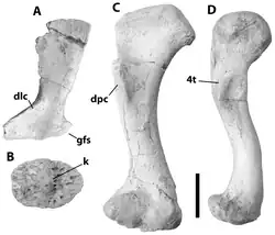 The skeleton is consistent with living representatives of the genus. The axis vertebra has a projection on the underside (a hypapophysis) which seems to have largely fused to the vertebra itself. The vertebrae are procoelous in shape, with a spherical projection extending from the back side which attaches to a concave socket on the front end of the preceding vertebra. The femora slightly bend in an S-shape. However, C. anthropophagus lacks the shallow bony pair of crests running from the eyes to the nose like in Indopacific Crocodylus, and lacks a boss (a lump of bone) on the middle of the snout like in Neotropical Crocodylus.