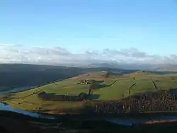 Geologically, the hill consists of Kinder Scout Grit, a kind of sandstone.[4] Both the hill's summits give excellent views of the surrounding countryside with Ladybower Reservoir, Derwent Edge and Win Hill being the main attractions. Between the two summits there is some evidence of an ancient megalithic standing stone circle. The circle originally consisted of five stones around a surviving mound of which only two are still upright.[5][6] There are also scheduled cairns in the vicinity.[7][8]