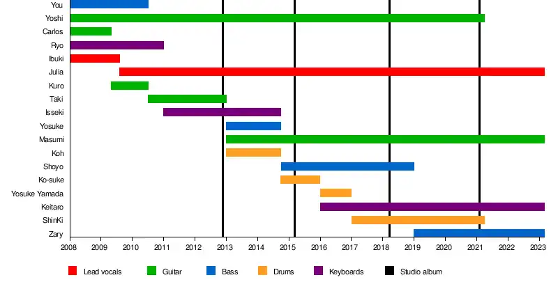 The band was founded in 2007 by producer Nancha and drummer Van-ry[1] in Tokyo.[2] A full line-up was assembled,[1] including vocalist Ibuki, later of Destrose and Fate Gear. In 2009, she was replaced by Julia.[2] By 2010, the only remaining original member was Yoshi.[1] The band released several independent songs as singles until 2011.[2] Their debut album, Birth of Romance, was released in 2012.[1] In 2015, they made their major debut with the album Royal Eternity,[2] released via Victor Entertainment.[1] Their third album, Gate of Fantasia, produced by Hizaki of Versailles, was released in 2018 via Zeno Records Japan.[3]