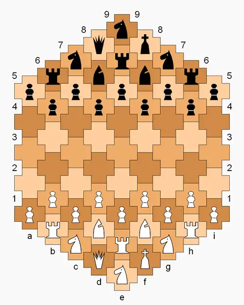 The diagram shows the starting setup. Special rank and diagonal paths determine how pieces move, as described below. Check, checkmate, and stalemate are as in standard chess. However a pawn has no initial two-step option, and a rook can make a one-step diagonal move.[a]