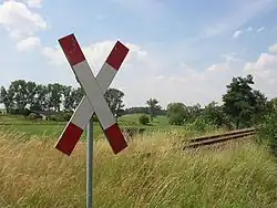 A crossbuck is a traffic sign used to indicate a level railway crossing. It is composed of two slats of wood or metal of equal length, fastened together on a pole in a saltire formation (resembling the letter X). Crossbucks are often supplemented by electrical warnings of flashing lights, a bell, and/or a boom barrier that descends to block the road and prevent traffic from crossing the tracks.