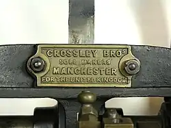 The engines were large horizontal heavy oil engines, typically used as generating plants or to power industrial plant such as air compressors, water pumps or mills. They were produced in a range of sizes, based on a standard cylinder unit, as either in-line or horizontally opposed cylinder engines.[3] They had (side valve) clerestory combustion chambers with single inlet and exhaust valves above and below the chamber. Other manufacturers at the time, notably Brush, produced very similar engines as modular, opposed cylinder units. Crossley's were distinctive for using a monobloc head on each cylinder, although this was in the form of a self-supporting wet liner and the water jacket around the whole cylinder bank was a separate casting. The engines were also unusual for being one of the few practical applications of an electrically driven supercharger.[3] This gave a relatively low boost pressure and was more of a scavenge blower, but it could increase output power by up to 50%.[3]