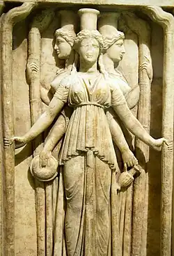 In Greek mythology, crossroads were associated with both Hecate and Hermes, with shrines and ceremonies for both taking place there. The herm pillar associated with Hermes frequently marked these places due to the god's association with travelers and role as a guide. Though less central to Greek mythology than Hermes, Hecate's connection to crossroads was more cemented in ritual. 'Suppers of Hecate' were left for her at crossroads at each new moon, and one of her most common titles was 'goddess of the crossroads.' In her later three-fold depictions, each of the three heads or bodies is often associated with one of three crossing roads.[1]