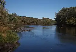 The Crow Wing River is a 113-mile-long (182 km)[5] tributary of the Mississippi River in Minnesota, United States. The river rises at an elevation of about 1391 feet in a chain of 11 lakes in southern Hubbard County, Minnesota, and flows generally south, then east,[6] entering the Mississippi at Crow Wing State Park northwest of Little Falls, Minnesota. Its name is a loose translation from the Ojibwe language Gaagaagiwigwani-ziibi ("Raven-feather River"). A wing-shaped island at its mouth accounts for the river's name.[7] Because of its many campsites and its undeveloped shores, the Crow Wing River is considered one of the state's best "wilderness" routes for canoeists; although it is shallow (seldom more than 3 feet (0.91 m) deep), it is nearly always deep enough for canoeing.[6]