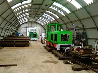 Between 1947 and the demise of commercial working, 23 internal combustion locomotives worked on the moors. All were 4-wheel vehicles, and they came from a variety of manufacturers. Nine locomotives were bought for preservation between 1992 and the close of the system. They were regauged to 2 ft 6 in (762 mm), and eight of them are in private collections,[23] while one Lister, works number 53977, built in 1964, was loaned to Doncaster Museum and Art Gallery in 2007.[24] One locomotive was abandoned at Bank Top around 1996, and it was this that sparked the idea for the railway. It was a 40 hp (30 kW) Simplex, manufactured by Motor Rail in 1967, with the works number 40s302, and bought new by Fisons.[25] When new, it had a fairly low cab, but a number of locomotives had their cabs extended upwards, to allow the drivers to stand up and see over the top of the wagons, and 40s302 was running with an extended cab and exhaust pipe by May 1992.[26] During restoration at North Lindsey College, the main bearing journals were found to be completely worn out, which was probably the reason for it being abandoned on the moors.[15] College members were unable to reassemble the locomotive at Crowle due to the Covid pandemic, and it was assembled by volunteers. This work was completed by 19 June 2021, when it ran under its own power again.[27] The restoration was shortlisted for the 2023 Heritage Railway Association awards, in the diesel and electric locomotion category.[28]