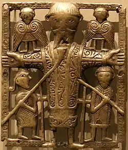 Crucifixion plaques are a type of Irish Early Medieval bronze sculpture consisting of a central panel of the still alive but crucified Jesus. He is surrounded by four ancillary panels showing Stephaton and Longinus (the lance and sponge bearers) in the lower quadrants and two hovering attendant angels in the upper quadrants. The borders or frames have cavities that once held nails or rivets, indicating that the plaques were intended as attachments to larger ecclesiastical objects, perhaps book shrines, processional crosses or altarpieces.[1]