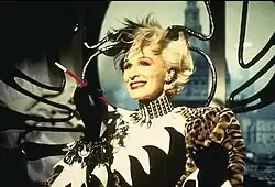Along with Close's performance, Cruella's costumes (by Anthony Powell and Rosemary Burrows) received appreciative attention, including a spread in Vanity Fair.[17] Claws were applied to her gloves, while her necklaces were made from teeth, to add to the idea that Cruella enjoyed wearing parts of dead animals. Nails were also projected from the heels to make them especially vicious in appearance. Some of her clothes were made out of leather or PVC, and Cruella always wore much make-up. She is seen in the film always smoking to give the appearance of a mysterious "villain".