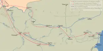 As they marched home, however, they ambushed and defeated a pursuing force in the Battle of Kunovica, where Mahmud Bey, son-in-law of the Sultan and brother of the Grand Vizier Çandarlı Halil Pasha, was taken prisoner.[7] Four days after this battle the Christian coalition reached Prokuplje. Branković proposed to Władysław and Hunyadi that they stay in Serbian fortified towns during the winter and continue their campaign against the Ottomans in Spring 1444. They rejected his proposal, and retreated.[10] By the end of January 1444 forces of Władysław and Hunyadi reached Belgrade, and in February they arrived at Buda where they were greeted as heroes.[11]