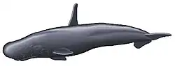 The high-finned sperm whale, or the high-finned cachalot, is an alleged variant or relative of the known sperm whale, Physeter macrocephalus, with an unusually tall dorsal fin from the North Atlantic. The physician Sir Robert Sibbald, in 1687, described an alleged stranded female individual on Orkney, saying its dorsal fins was similar to a "mizzen mast". Carl Linnaeus listed Physeter microps and Physeter tursio as High-finned sperm whales in the 10th edition of Systema Naturae in 1758. There was much confusion between the reports of sperm whales, killer whales, pilot whales and beluga whales, and Georges Cuvier sorted the confusion out and determined that there were no high-finned sperm whales and that there was only one species of sperm whale in one genus.[2][3] Sibbald was at least aware of the existence of killer whales and beluga whales, and he noted that he did not directly witness the whales above so the report of the shape of their heads and some other features is unclear.[4] Furthermore, it has also been pointed out that the high-finned Physeter species listed by Linnaeus may have seen killer whales, and that his use of the scientific name Delphinus orca may have been for bottlenose dolphins.[5] Another alleged sighting was off the Annapolis Basin, Nova Scotia, Canada on September 27, 1946, where the creature was apparently trapped there for two days. Its length was estimated to be between 3 and 30 metres (10 and 100 ft).