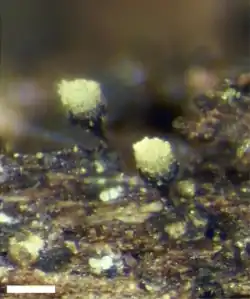 In particular, the species C. blascoi is defined as a lichen measuring 0.15–0.36 mm in height without mazaedium, with a peridium spherical or urniform in shape measuring 0.05–0.10 × 0.10–0.15 mm that appears dark violet when wet but black and shiny when dehydrated, with an ocre disk around the peridium, and a stalk measuring 0.10–0.26 × 0.02–0.04 mm that is smooth, black and shiny, sometimes with a broader base.[1]