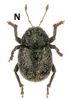 Adults reach a length of about 3.2 mm and have an integument black body, with the antennae and tarsi reddish.