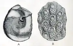 Cryptosula pallasiana is an encrusting colonial bryozoan with colonies growing to roughly circular patches with diameters of a few centimetres. Each colony consists of a number of individual organisms called zooids. Each zooid lies in a rigid rectangular box called a zooecium up to 1 mm (0.04 in) long and 0.5 mm (0.02 in) wide. These are fitted together in a regular pattern, radiating out from the position in which the founding zooid settled to start the colony, each daughter zooid's head being further away from the centre of the colony than its foot. The upper surface of the zooecium has an opening called the aperture at the head end, and through this the zooid's lophophore is extended to feed. The aperture is a round-cornered square and there are pores in the upper surface of the zooecium both above and below it. The colonies are white, beige, pink or orange.[2]