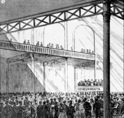 The Crystal Palace was an exhibition hall built for the Montreal Industrial Exhibition of 1860, originally located at the foot of Victoria Street (one block west of University) between Sainte-Catherine and Cathcart Streets, then relocated to Fletcher's Field. It was used for temporary exhibitions, and in winter, housed an ice skating rink.