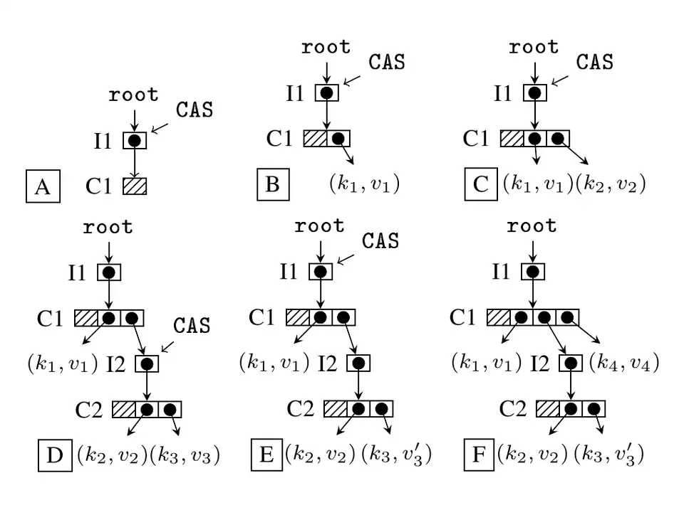 The figure above illustrates the Ctrie insert operation. Trie A is empty - an atomic CAS instruction is used to swap the old node C1 with the new version of C1 which has the new key k1. If the CAS is not successful, the operation is restarted. If the CAS is successful, we obtain the trie B. This procedure is repeated when a new key k2 is added (trie C). If two hashcodes of the keys in the Ctrie collide as is the case with k2 and k3, the Ctrie must be extended with at least one more level - trie D has a new indirection node I2 with a new node C2 which holds both colliding keys. Further CAS instructions are done on the contents of the indirection nodes I1 and I2 - such CAS instructions can be done independently of each other, thus enabling concurrent updates with less contention.