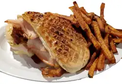 The sandwich is built on a base of lightly buttered Cuban bread and contains sliced roast pork, thinly sliced Serrano ham, Swiss cheese, dill pickles, and yellow mustard. In Tampa, Genoa salami[11] is traditionally layered in with the other meats, probably due to the influence of Italian immigrants who lived side by side with Cubans and Spaniards in Ybor City.[12] Tomatoes and lettuce are available additions in many restaurants, but these are considered by traditionalists as an unacceptable Americanization of the sandwich.[6][13]