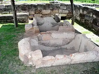 In several ports of the site are some constructions with shape and dimensions similar to storage areas, possibly for grain, food, or manufactured products. These underground deposits were built with limestone walls and floor slabs. A large amount of ceramic pots fragments were found in these.