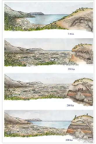 Archaeologists recognize a stratigraphy of 17 layers, dated between 350 and 121,000 years ago.[1] Three main periods of occupation are recognized: 350,000 years ago, 200,000 to 150,000 years ago, and 120,000 years ago.[4] Human occupants ate a wide variety of animals,[5] including ungulates of all sizes,[1] besides tortoises[6] and birds.[7] Throughout the occupation, they ate young elephants.[1] A relative rarity for the Middle Pleistocene is the frequency with which the remains of rabbits, marked with cuts, are found; such small, quick prey is unusual for the period, and is most likely a specific feature of a unique locality.[8]