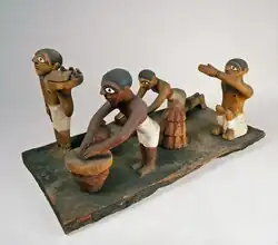 Archeological evidence shows that beer was made by first baking "beer bread", a type of well-leavened bread, lightly baked so as to avoid killing the yeasts, which was then crumbled over a sieve, washed with water in a vat and finally left to ferment.[6] Such "beer bread" resembles closely the type used in the preparation of bouza, a traditional, home-brewed beer still consumed in Egypt today.[7][8]