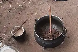 Seswaa, tshotlho or leswao (pounded beef) is a popular traditional meat dish made for most special occasions. Usually prepared by men, it is cooked in a three-legged iron pot, simmered until soft with only salt, cooking oil and water. It is usually prepared using goat meat or beef and it is a staple in meals associated with traditional occasions such as funerals and weddings.[5]