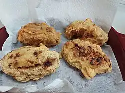 Among the most representative appetisers and soups are sancocho de gallina (chicken soup with root vegetables), of beef, of pork ribs or triphasic, sancocho of fish, the ajiaco (potato and corn soup),[8][9] patacones (fried green plantains), and buñuelos (Christmas season deep fried dough balls).