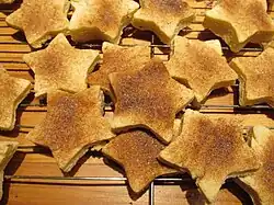 - Biscochito – anise-flavored cookie sprinkled with cinnamon sugar, traditionally made with lard.[16] It was developed by residents of New Mexico over the centuries from the first Spanish colonists of what was then known as Santa Fe de Nuevo México. Although biscochitos may sometimes be found at any time of year, they are a traditional Christmas cookie.[15]: 111–112